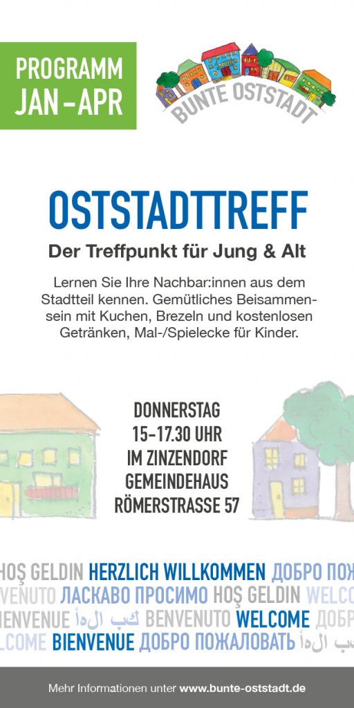 Die Bewirtung des Oststadttreffs wird durch ein ehrenamtliches Team geleistet. 14 -tägig im Wechsel sind die Zinzendorfkirchengemeinde und der Kinderschutzbund mit einem Angebot siehe Programmflyer vor Ort..